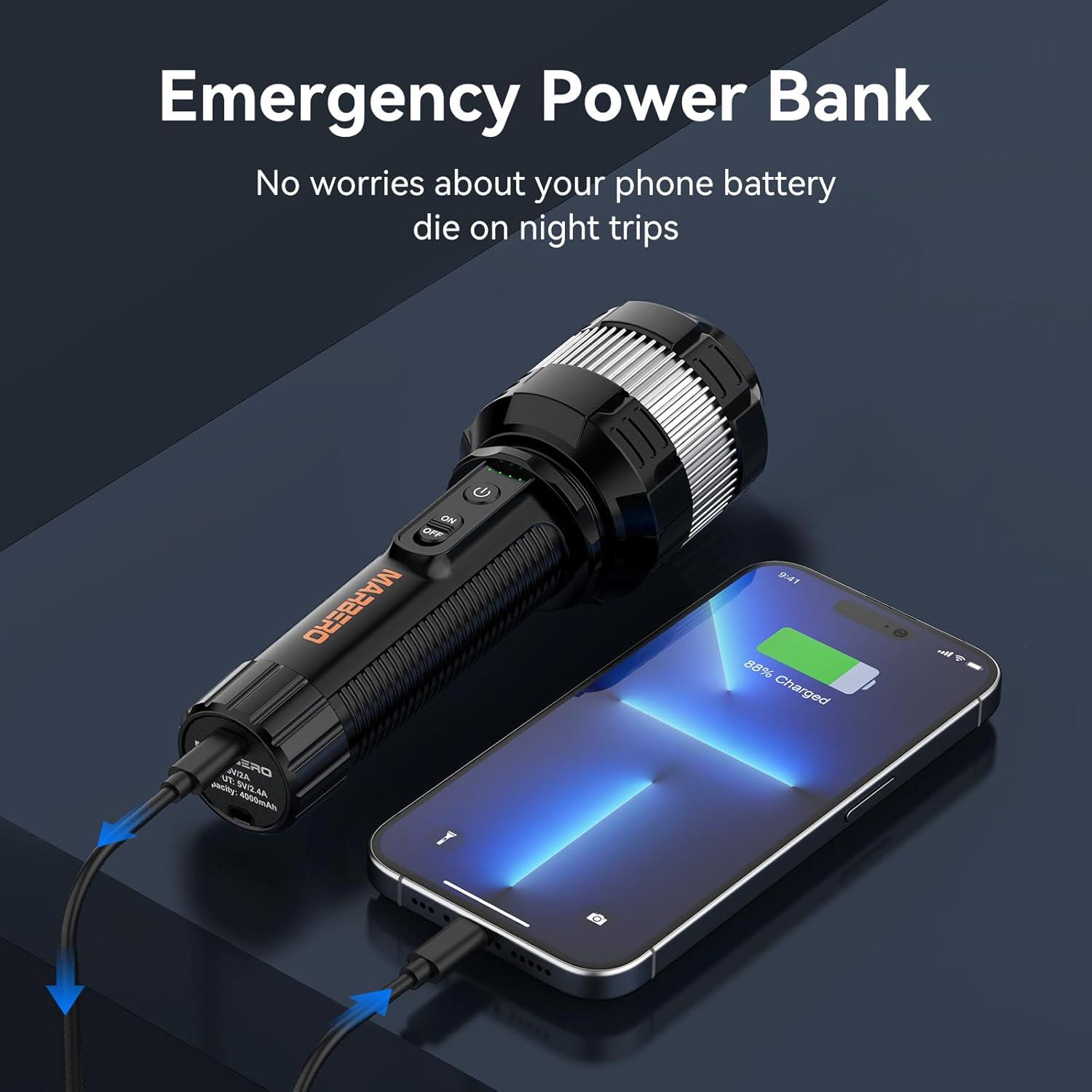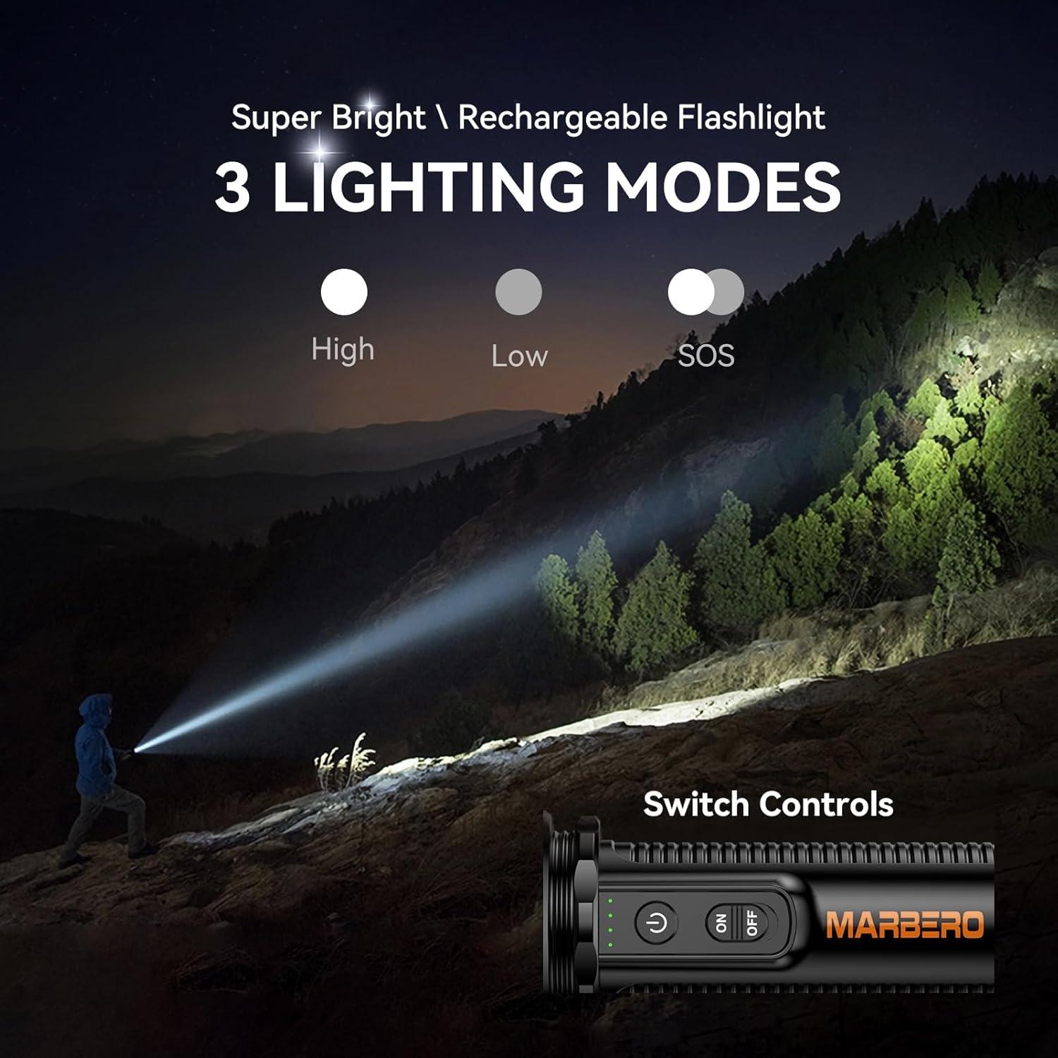 MARBERO 3 Modes Rechargeable LED Flashlight 4000mAh High Brightness Focused Beam Tactical Light Waterproof Portable Compact Flashlight for Hiking Camping Emergency Home Use