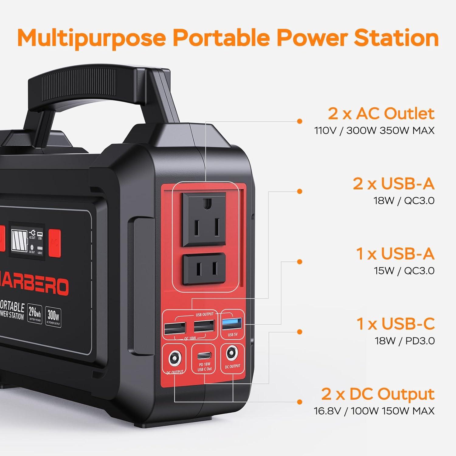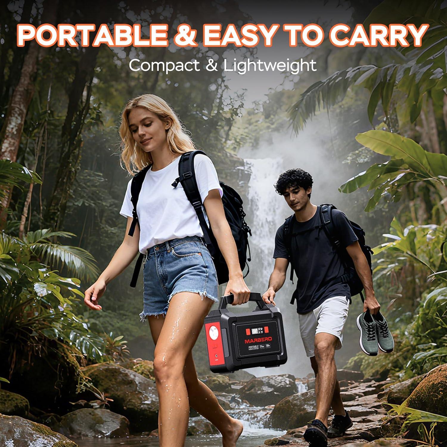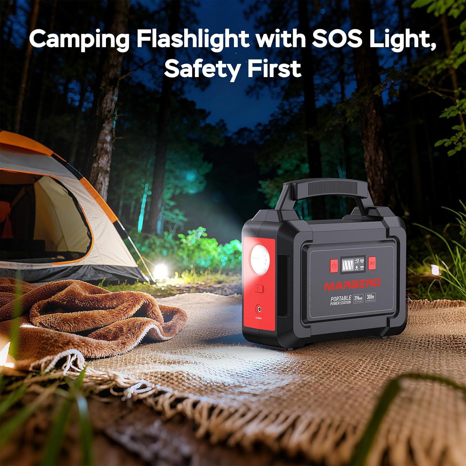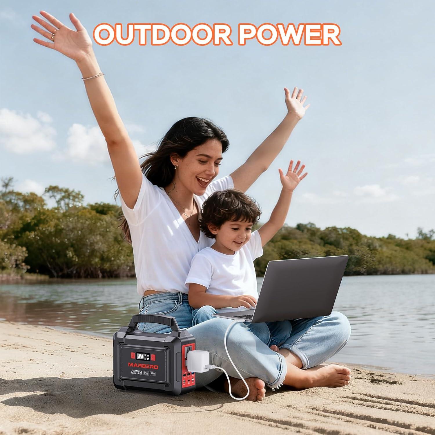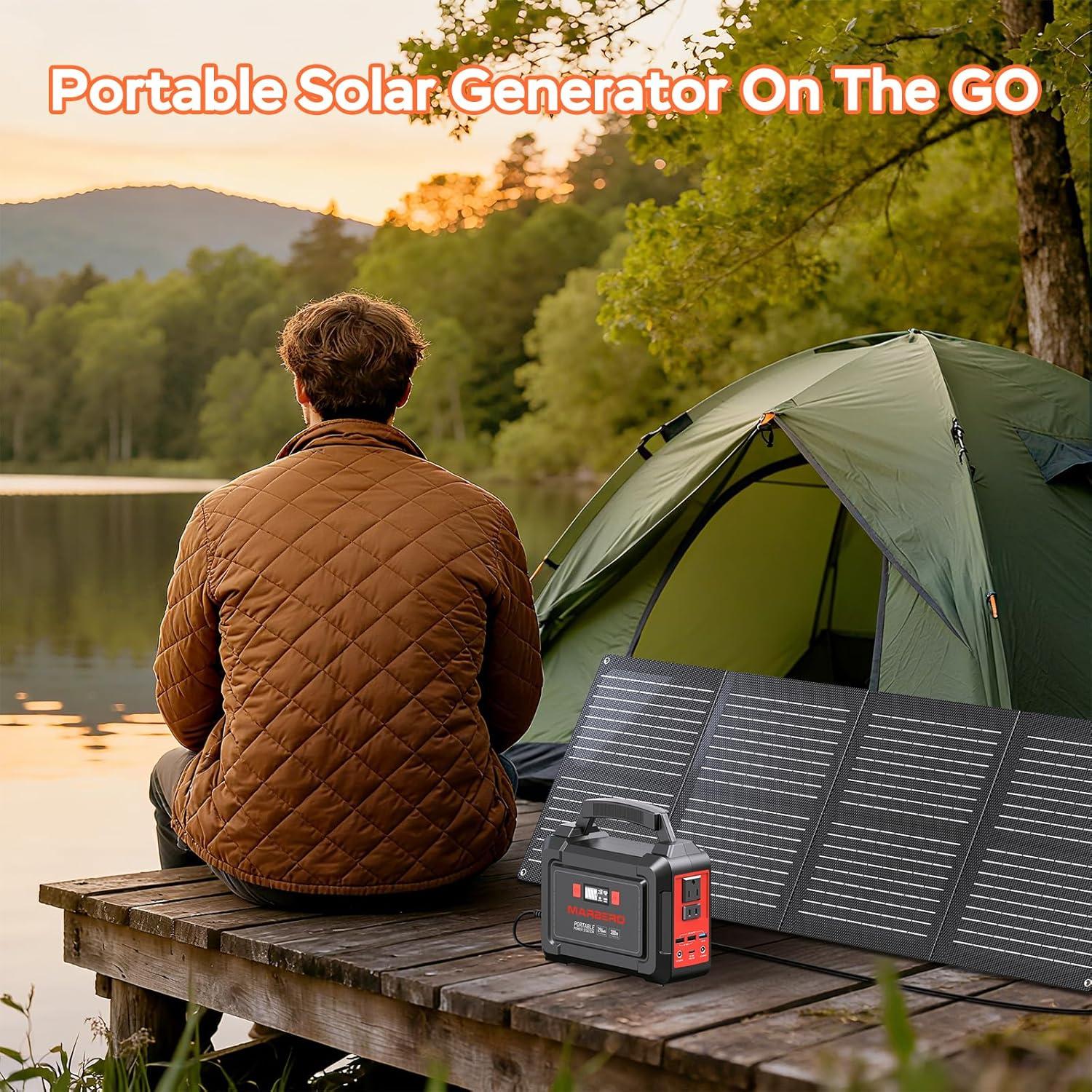296WH SOLAR GENERATOR WITH SOLAR PANEL 60W: Power your outdoor adventures with the MARBERO Solar Generator M188 and 60W Portable Solar Panel. This portable power station featuring a 296Wh (80,000mAh) high capacity battery and 2 AC outlets with a maximum power output of 300W. It's a ideal gadget set for extended stays off the grid. With this backup power bank we can power our devices and enjoy the freedom of uninterrupted energy where you are!