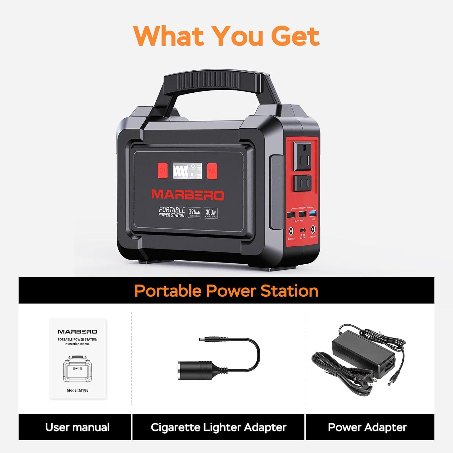 WHAT YOU GET: 1*MARBERO M188SL60 Portable Power Station, 1*MARBERO Solar Panel 60W Solar Panel, 1*Power Adapter, 1*Cigarette Lighter Adapter, 1*User Manual.